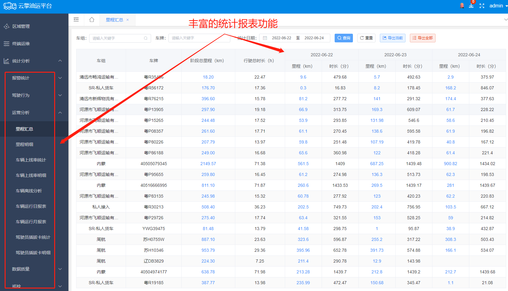 渣土運(yùn)輸安全管理:實(shí)時(shí)定位、行車(chē)狀態(tài)、歷史軌跡、實(shí)時(shí)視頻、歷史視頻、主動(dòng)安全事件及報(bào)警匯總查看等基礎(chǔ)監(jiān)控及執(zhí)法依據(jù)留存。渣土運(yùn)輸違規(guī)運(yùn)營(yíng)監(jiān)測(cè):車(chē)輛超載/蓋板/篷布不密閉,沿途灑漏、不在指定消納場(chǎng)亂倒渣土污染環(huán)境,遠(yuǎn)程車(chē)輛控制、參數(shù)/指令下發(fā),可在指定路段限速,非傾倒地點(diǎn)限制舉升等。 渣土運(yùn)輸資質(zhì)管理:無(wú)紙化線(xiàn)上登記備案、快速辦證下發(fā),提高申請(qǐng)及審批效率及便利,源頭管控運(yùn)輸合規(guī)證件,有效查處無(wú)資質(zhì)車(chē)輛。正規(guī)施工工地及消納場(chǎng)管理:許可審批及顯示,場(chǎng)地圍欄管控,避免違規(guī)作業(yè)及亂卸亂倒,有助于提供執(zhí)法監(jiān)管依據(jù)。工地,消納場(chǎng),運(yùn)輸區(qū)域,運(yùn)輸企業(yè),駕駛員,車(chē)輛,終端等資源管理。運(yùn)輸業(yè)務(wù)管理:運(yùn)單及工程相關(guān)的趟次、里程統(tǒng)計(jì)、運(yùn)輸方數(shù)等統(tǒng)計(jì)及效益管理等。