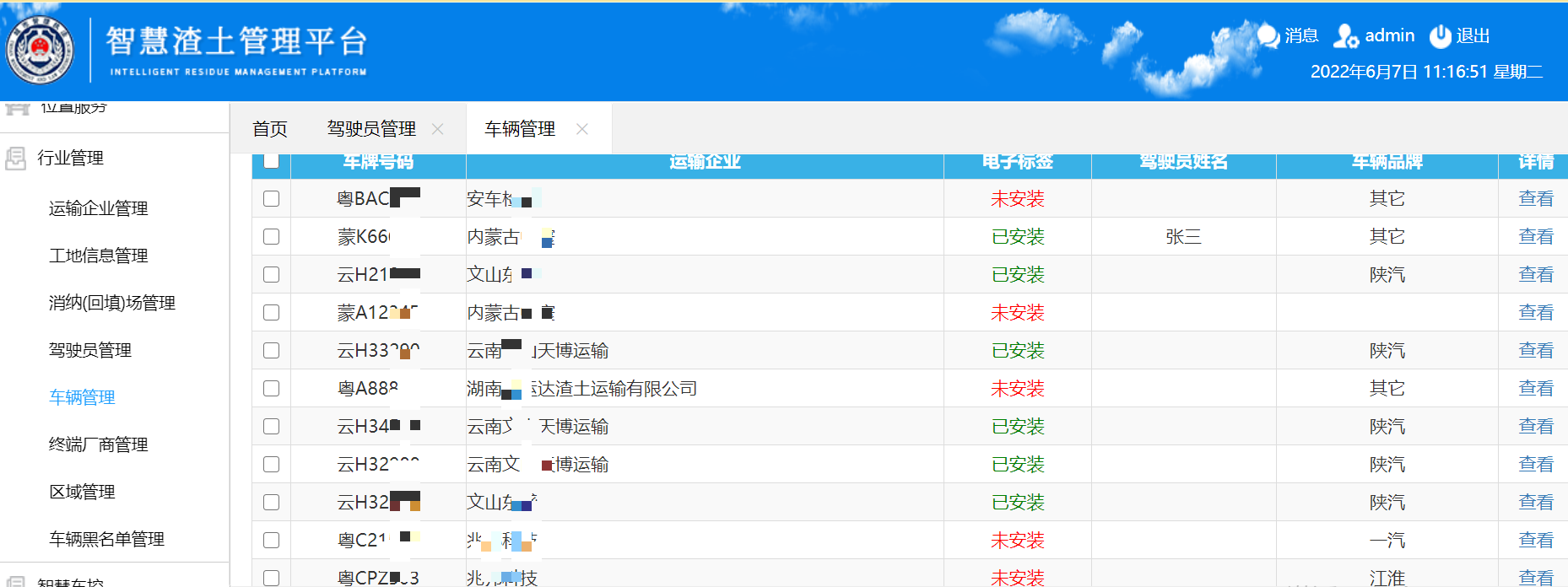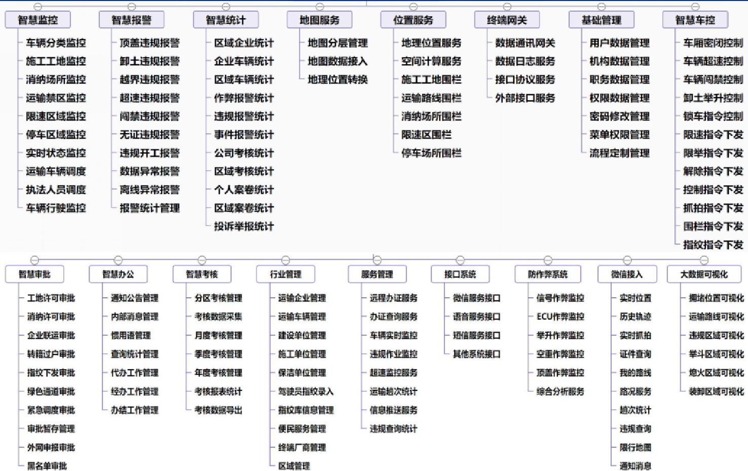 渣土運(yùn)輸安全管理:實時定位、行車狀態(tài)、歷史軌跡、實時視頻、歷史視頻、主動安全事件及報警匯總查看等基礎(chǔ)監(jiān)控及執(zhí)法依據(jù)留存。渣土運(yùn)輸違規(guī)運(yùn)營監(jiān)測:車輛超載/蓋板/篷布不密閉,沿途灑漏、不在指定消納場亂倒渣土污染環(huán)境,遠(yuǎn)程車輛控制、參數(shù)/指令下發(fā),可在指定路段限速,非傾倒地點限制舉升等。 渣土運(yùn)輸資質(zhì)管理:無紙化線上登記備案、快速辦證下發(fā),提高申請及審批效率及便利,源頭管控運(yùn)輸合規(guī)證件,有效查處無資質(zhì)車輛。正規(guī)施工工地及消納場管理:許可審批及顯示,場地圍欄管控,避免違規(guī)作業(yè)及亂卸亂倒,有助于提供執(zhí)法監(jiān)管依據(jù)。工地,消納場,運(yùn)輸區(qū)域,運(yùn)輸企業(yè),駕駛員,車輛,終端等資源管理。運(yùn)輸業(yè)務(wù)管理:運(yùn)單及工程相關(guān)的趟次、里程統(tǒng)計、運(yùn)輸方數(shù)等統(tǒng)計及效益管理等。